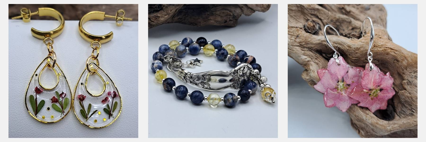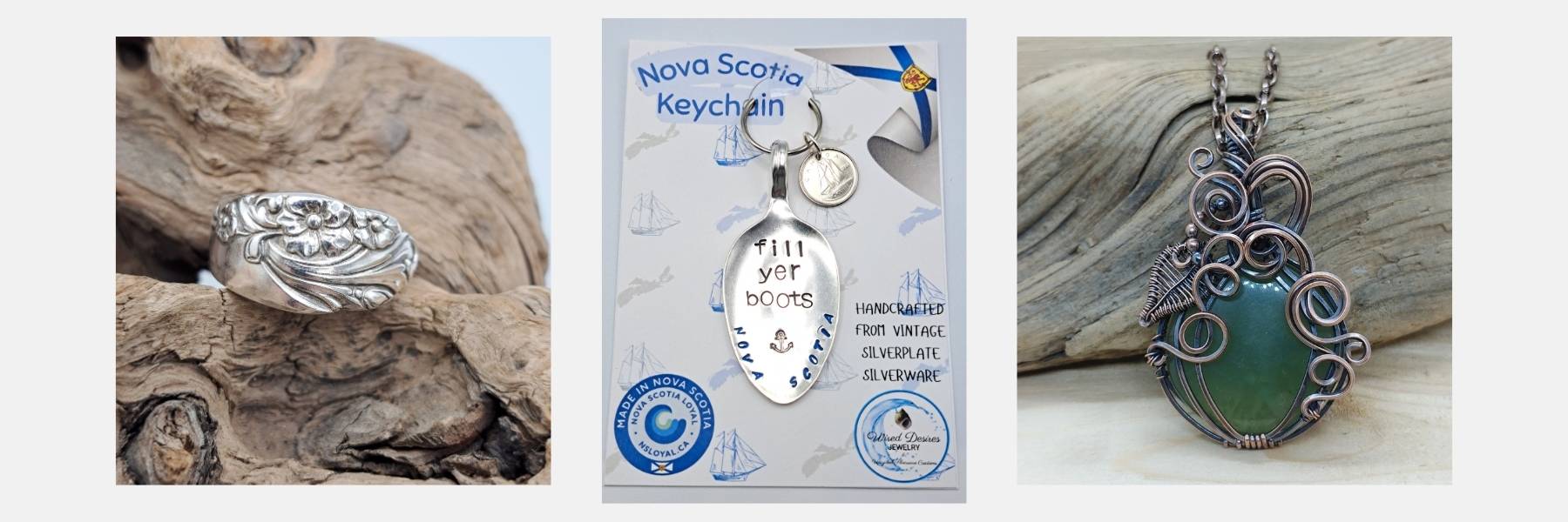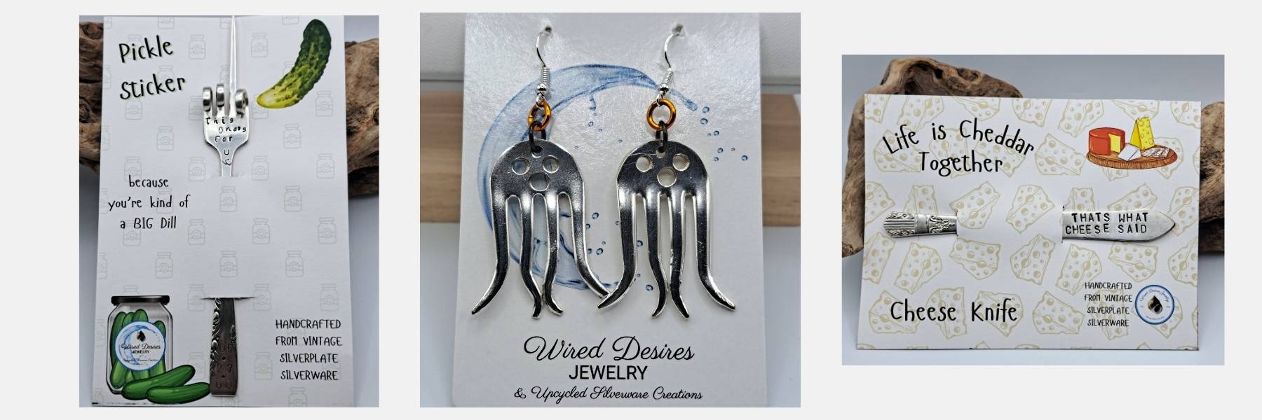 Jewelry and accessories crafted from vintage silverware and other mediums.