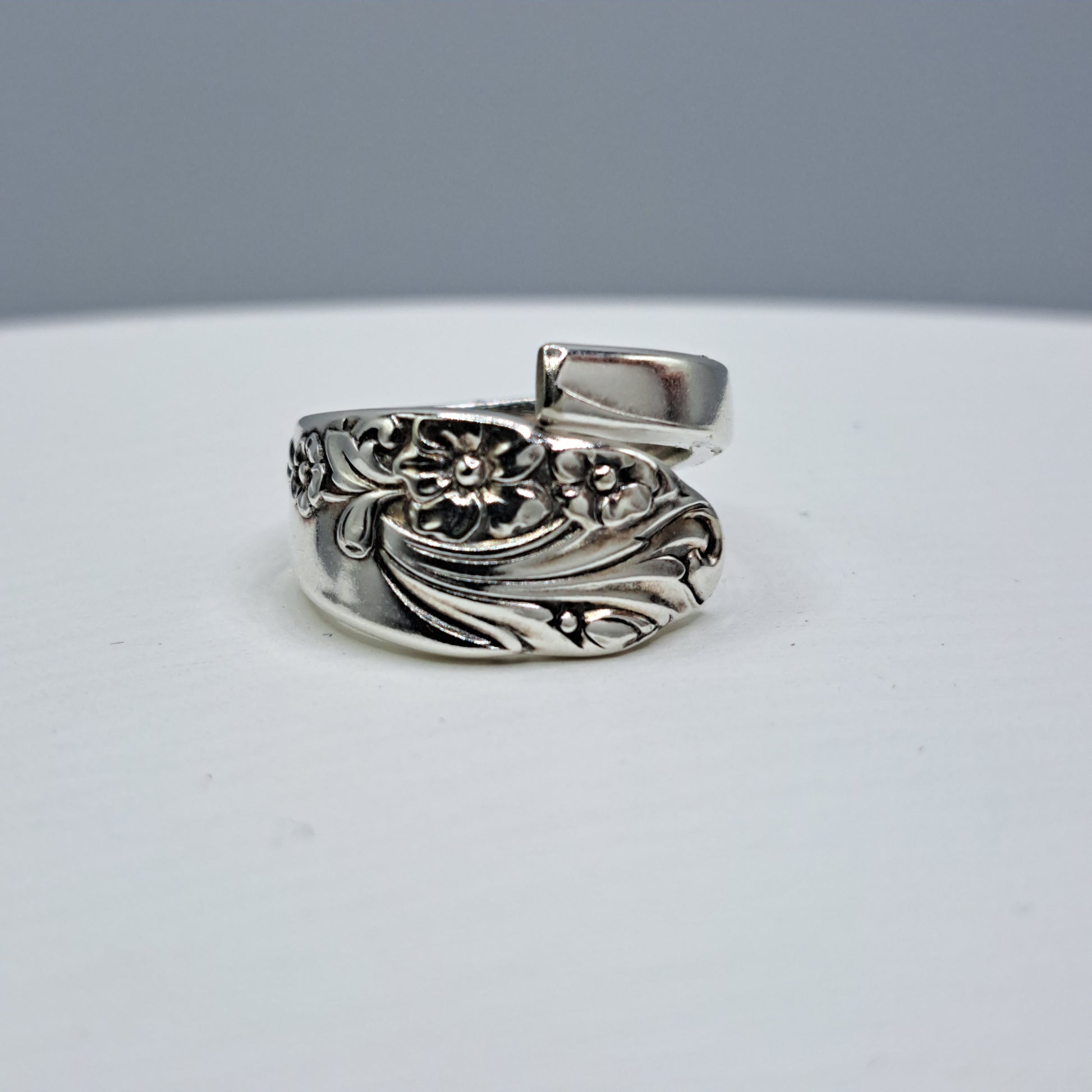 This spiral spoon ring is handcrafted from vintage silverware and formed by hand into a wearable ring.
